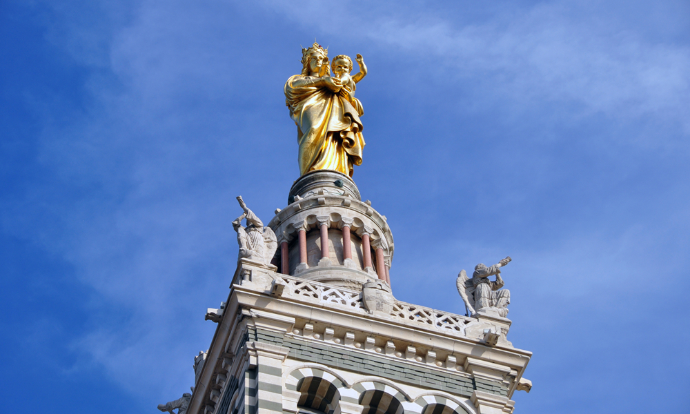 教堂主體建筑上方有一座金色的高達9.7米的鍍金圣母像,據(jù)說,幾乎在馬賽的任何角度都可看到這尊閃閃發(fā)光的圣母像,教堂也因此成為馬賽的標志。李仁奇 攝