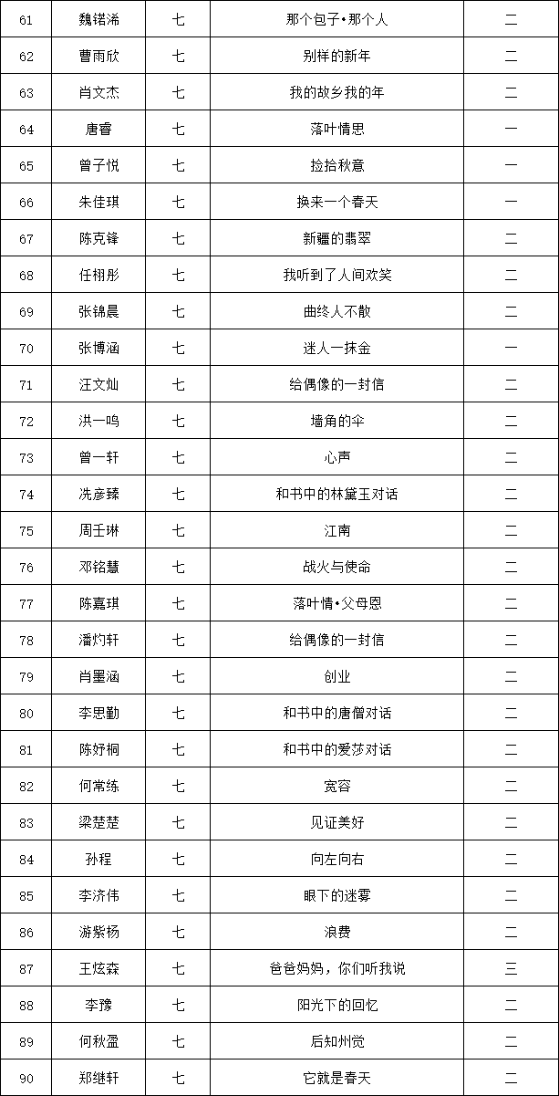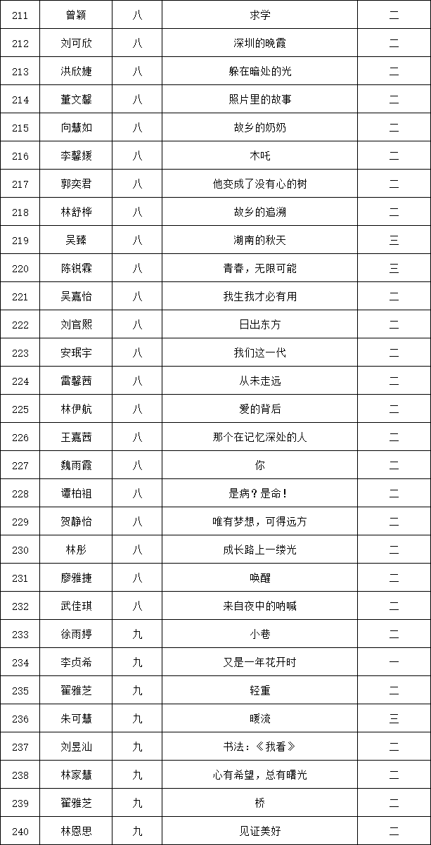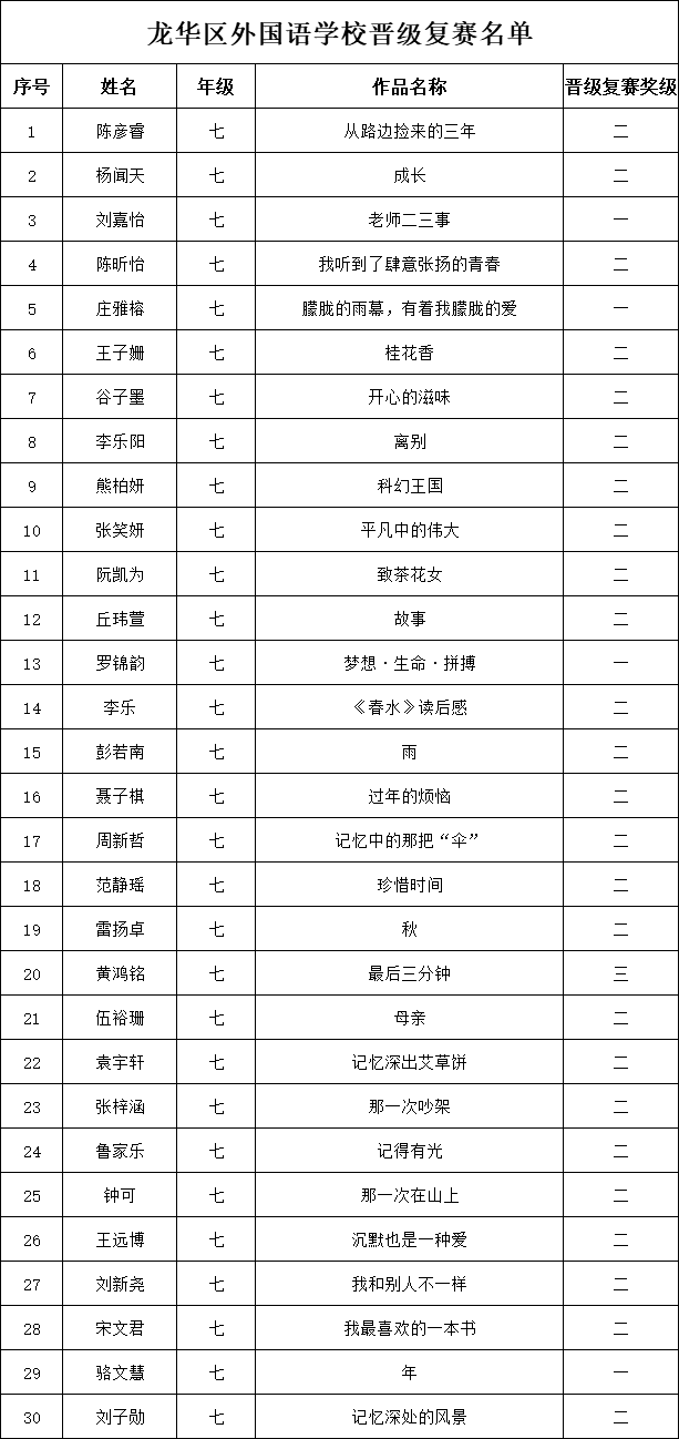 自2021年1月,活動征稿啟動以來,獲得了深圳市廣大中小學生、教師、文學愛好者的熱烈響應積極參與,吸引了深圳百余所學校的上萬人關注報名?,F(xiàn)公布龍華區(qū)外國語學校專場晉級復賽名單如下: