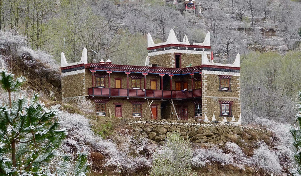 當(dāng)群山還披著皚皚白雪,春寒尚未消盡,甲居藏寨的梨花卻已悄然開放。李仁奇 攝