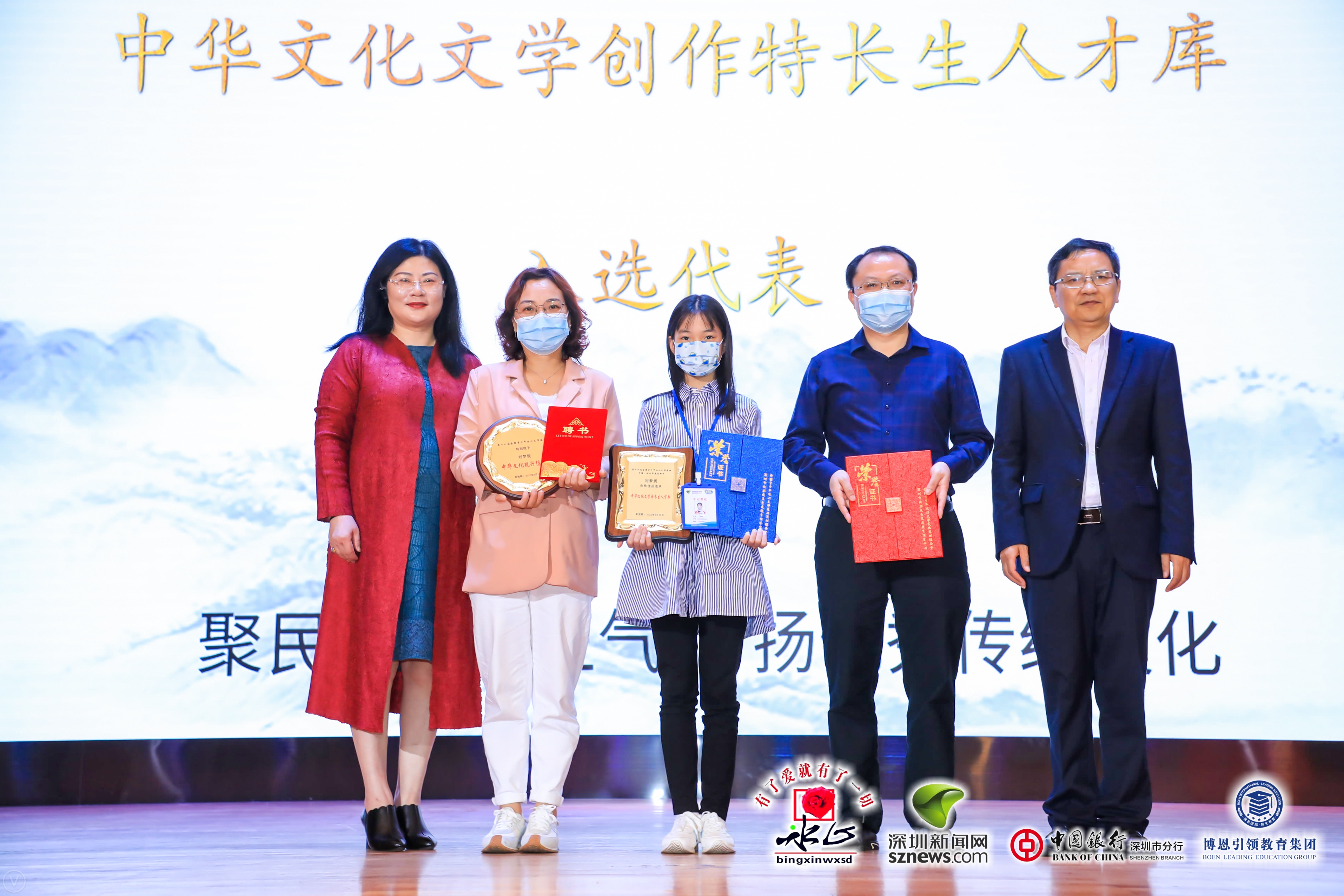 對入選“中華文化現(xiàn)行倡導(dǎo)者”“中華文化文學(xué)特長生人才庫”和“深網(wǎng)小記者”的代表劉夢妮進行頒獎頒證