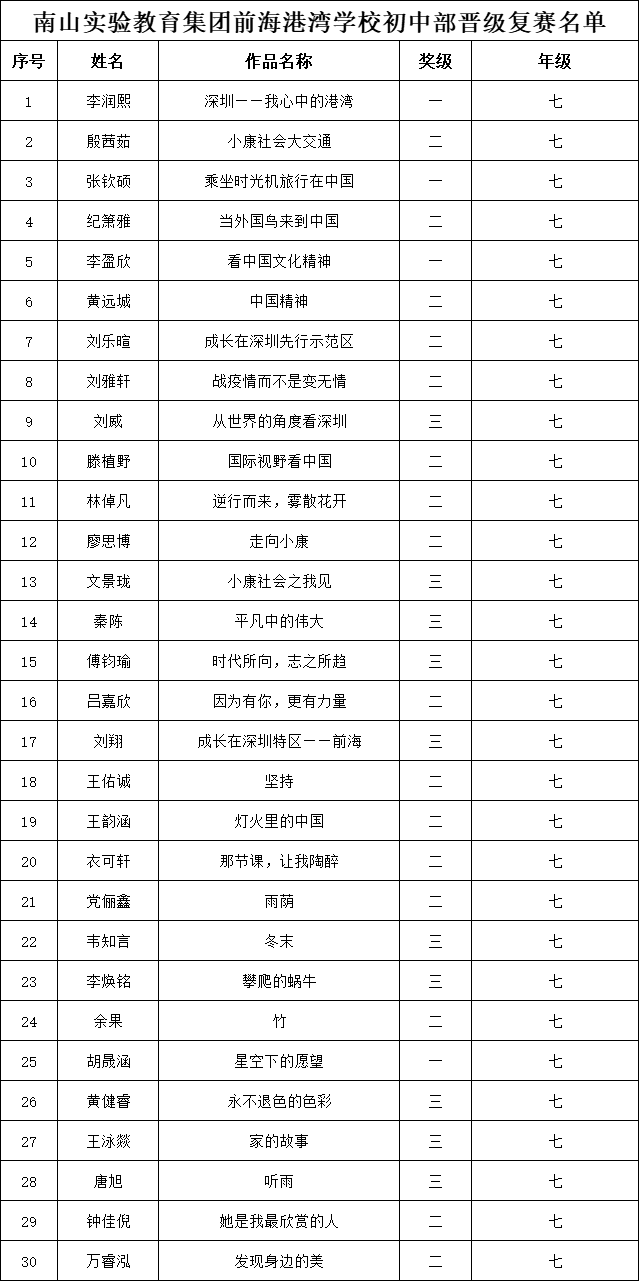 自2021年1月,活動征稿啟動以來,獲得了深圳市廣大中小學生、教師、文學愛好者的熱烈響應積極參與,吸引了深圳百余所學校的上萬人關注報名?,F(xiàn)公布南山實驗教育集團前海港灣學校(初中部)專場晉級復賽名單如下: