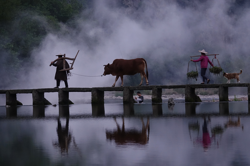 一對老夫妻一前一后,你牽著黃牛我挑著擔(dān),還自帶云霧繚繞的背景,多么美麗的畫面。李仁奇 攝