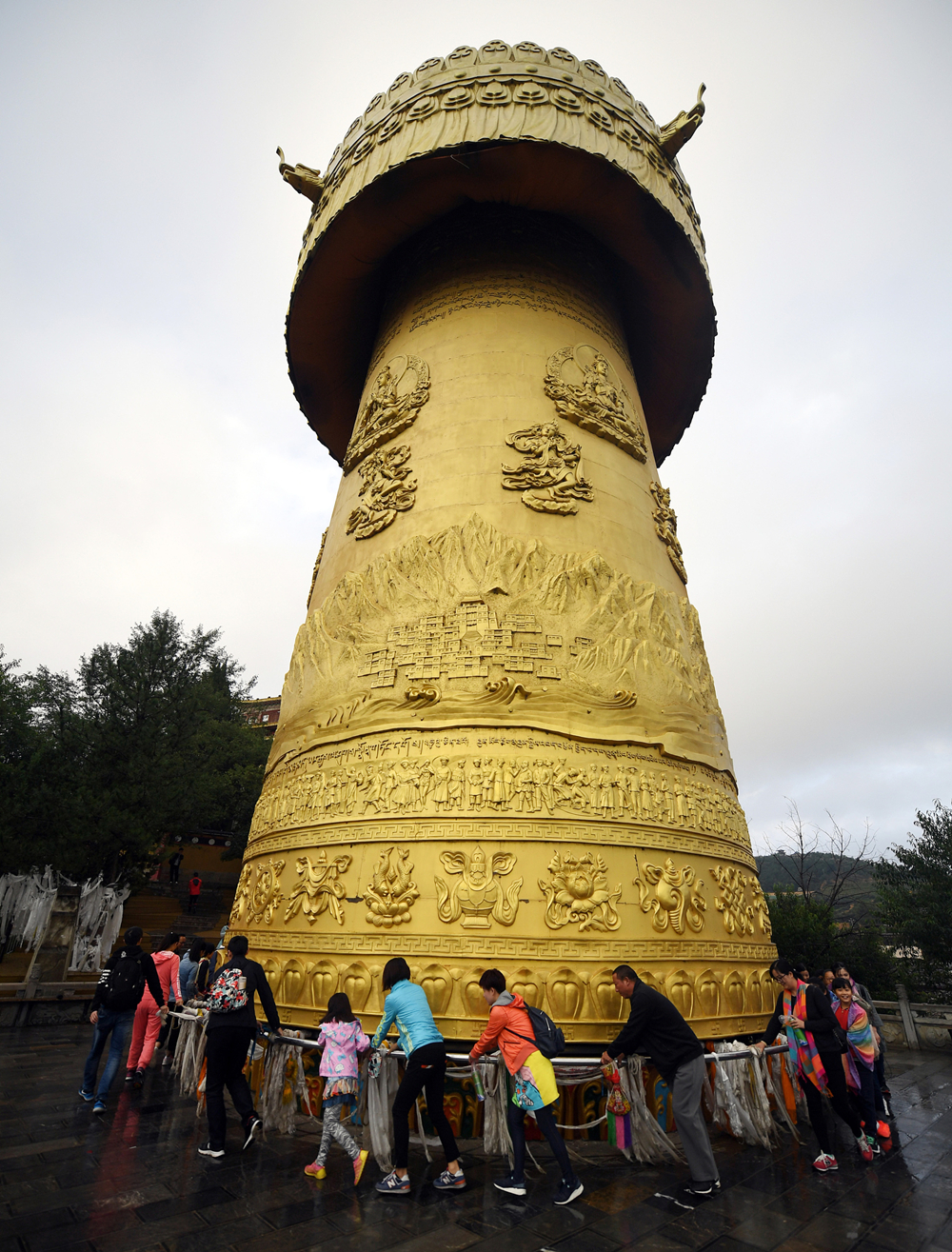 甘肅甘南藏族自治州瑪曲縣的寧瑪寺大藏經(jīng)轉(zhuǎn)經(jīng)筒矗立在金碧輝煌的寺院建筑群里,總投資4500萬(wàn)元,歷經(jīng)四年,于2018年建成。筒體浮雕由尼泊爾工匠使用60公斤黃金手工鍛鑄鎏金而成。轉(zhuǎn)經(jīng)筒自身重量達(dá)320噸,內(nèi)裝大藏經(jīng)1008部共11萬(wàn)冊(cè)。李仁奇 攝