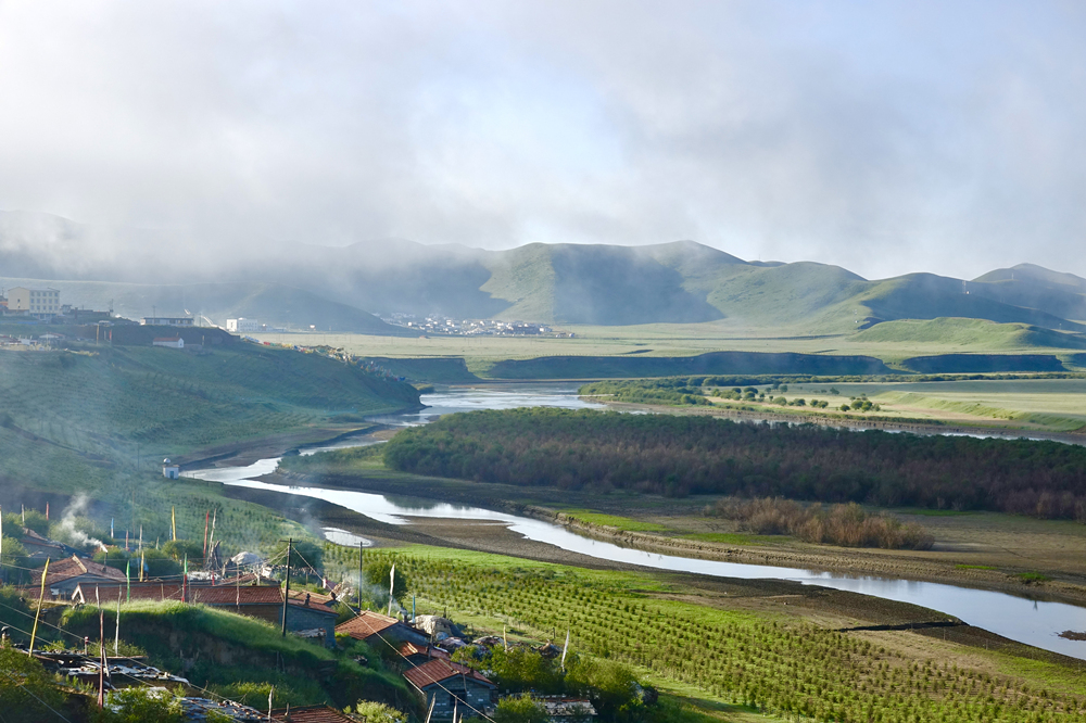 黃河的這一段流程是四川與甘肅的界河,河西為甘肅,河?xùn)|為四川。黃河自甘肅一側(cè)來,白河自黃河第一灣灣頂匯入,型如“S”型,黃河之水猶如仙女的飄帶從天邊緩緩飄來,在四川邊上輕輕撫了一下又轉(zhuǎn)身飄回青海,故此地稱九曲黃河第一灣。李仁奇 攝