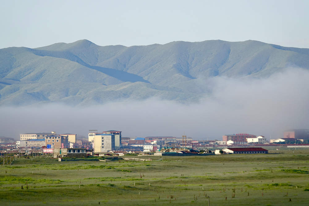 往白河方向遠(yuǎn)眺,群山煙霧繚繞,如夢似幻;山下索克藏寺,沐浴晨光。航拍圖,郭國政 攝