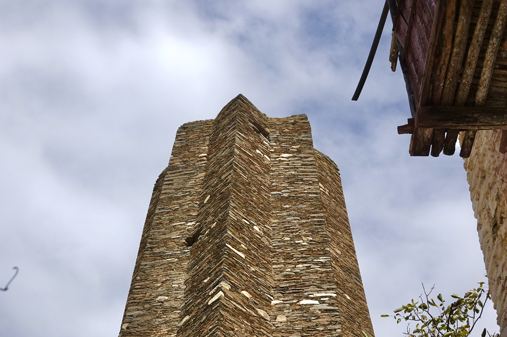 碉樓的建造不用外搭腳手架,沒有圖紙,全憑工匠的經(jīng)驗(yàn),七凸八翹沒有一塊相同、大大小小的石塊壘砌成平整如磚墻的面,工匠必須具有復(fù)雜的處理各種材料之間犬牙交錯的矛盾的能力,這種藝術(shù)能力里面蘊(yùn)藏了復(fù)雜精湛的藝術(shù),而且最終的結(jié)果是碉樓像金字塔一樣穩(wěn)固。李仁奇 攝
