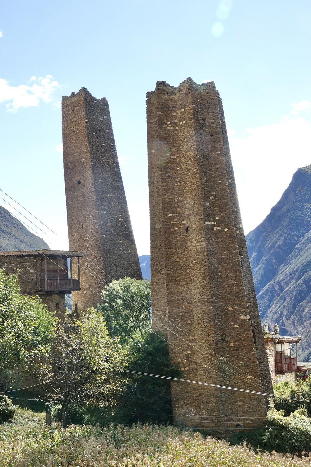 在它的后面三個碉樓特別吸引眼球。左邊第一座是五角碉,第二座是八角碉,第三座是常見的四角碉。李仁奇 攝