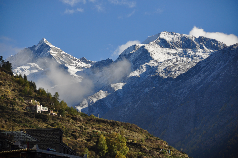 如果天氣晴好,在四姑娘山鎮(zhèn)旁山坡上的觀景臺(tái)可以眺望到同框的四座雪峰。李仁奇 攝