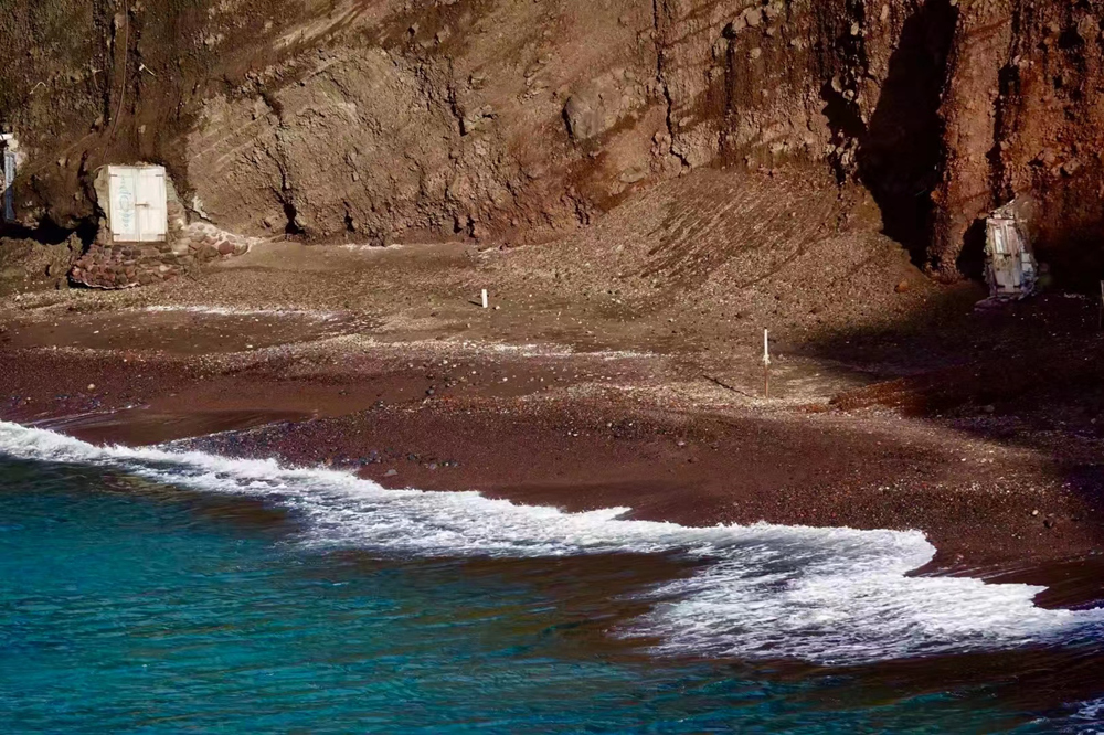 紅沙灘距離阿科羅提利遺址不遠,這里像是神話一般的地方。海水被大片深紅色高聳的山巖所包圍,紅色沙灘十分罕見,在陽光的照耀下更加顯得耀眼奪目。李仁奇 攝
