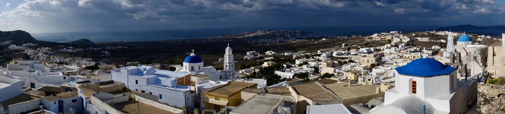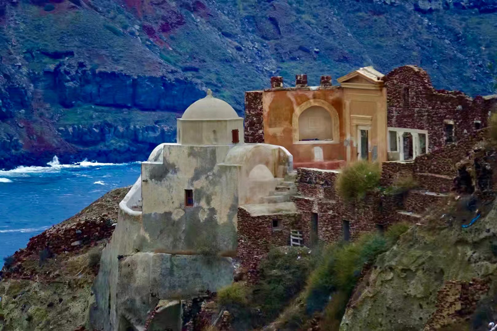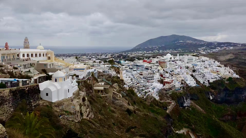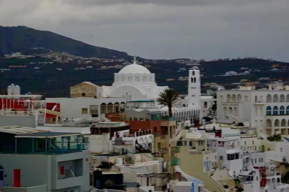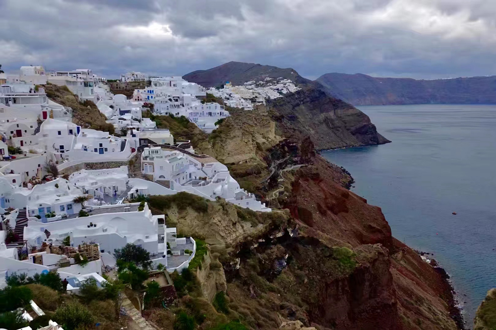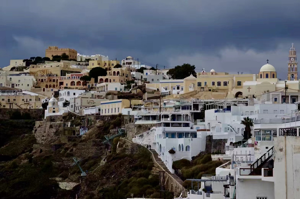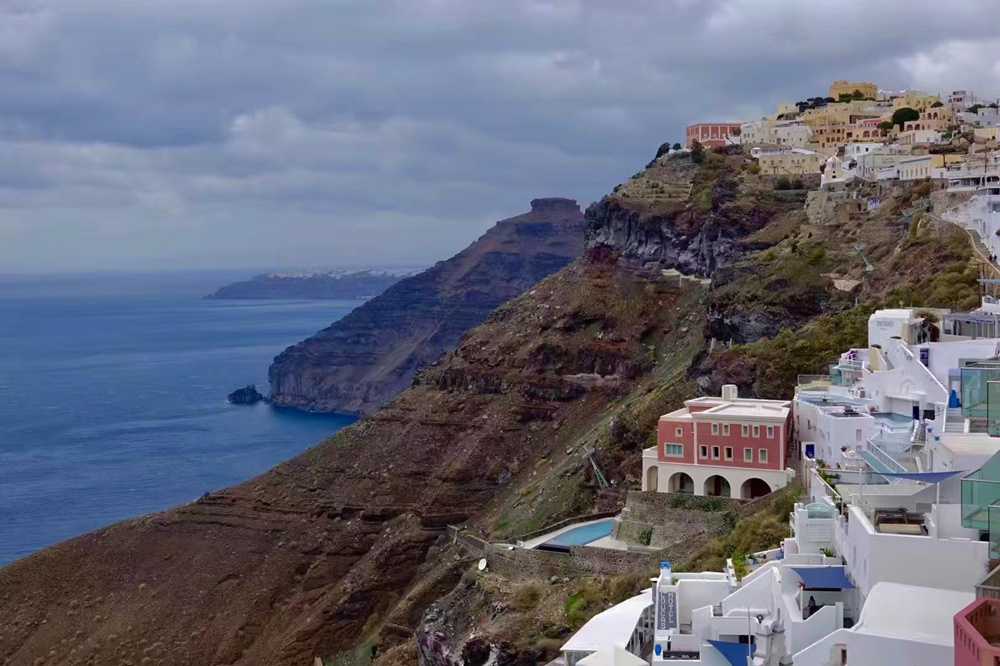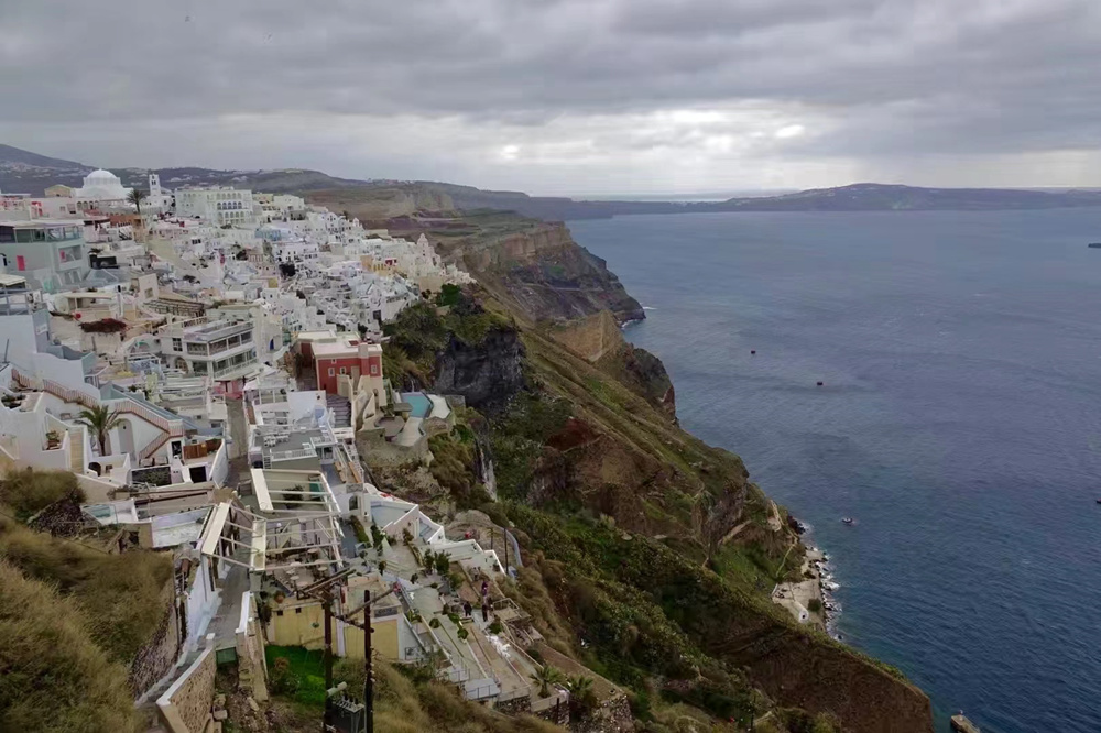費拉碼頭附近有許多懸崖,無數(shù)的白色小屋依山而建,與天空、海洋混成一體,這是地中海獨有的景觀。李仁奇 攝