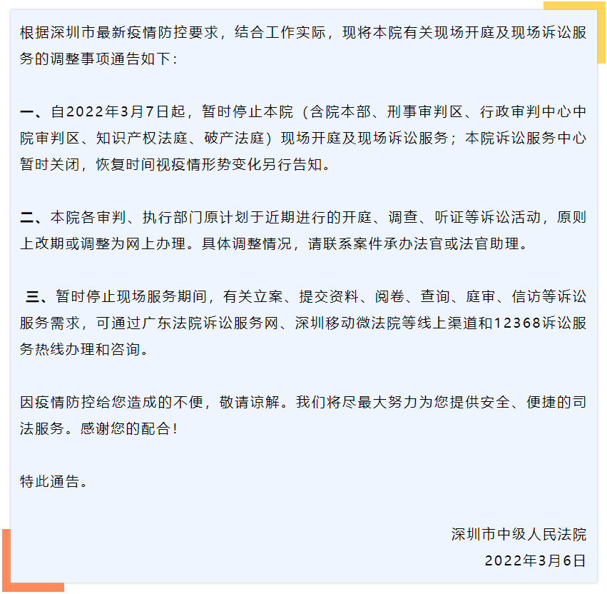 讀特客戶端·深圳新聞網(wǎng)2022年3月7日訊(記者 張玲)3月6日夜間,深圳市中級(jí)人民法院發(fā)布通告,從2022年3月7日開始暫?,F(xiàn)場(chǎng)開庭及現(xiàn)場(chǎng)訴訟服務(wù),訴訟服務(wù)中心也暫時(shí)關(guān)閉,恢復(fù)時(shí)間另行告知。