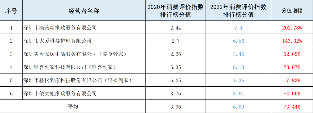 通過與2020年6月公布的深圳市家政行業(yè)消費評價指數(shù)排行榜結果對比,共有6家經(jīng)營者再次上榜,指數(shù)分值平均增長2.13分,平均增幅73.44%。其中5家經(jīng)營者消費評價指數(shù)得分均有上升。