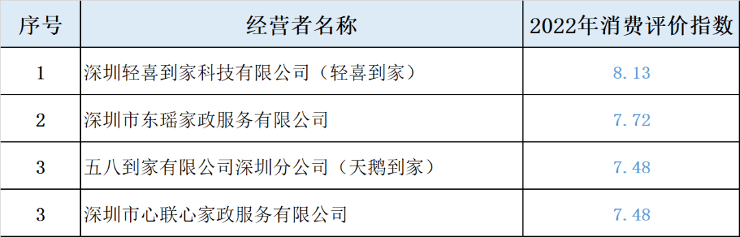 備注:本排名依據(jù)深圳市消委會“315消費通”平臺2021年2月1日至2022年1月31日期間,家政行業(yè)年投訴量3宗以上經(jīng)營者消費評價指數(shù)從高到低排序。