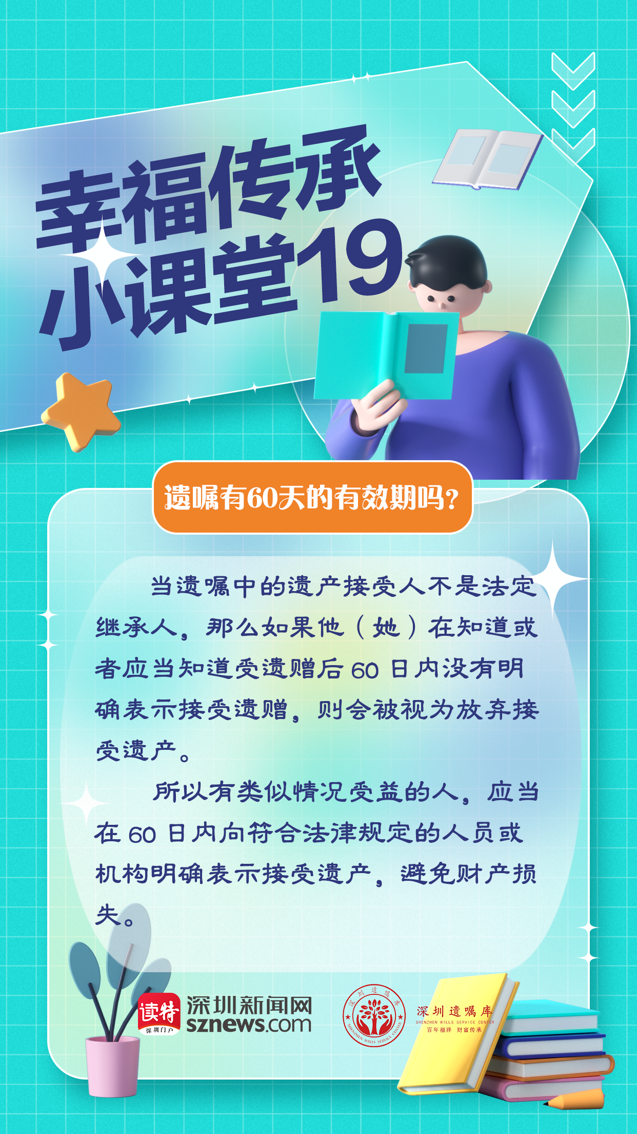 讀特客戶端·深圳新聞網(wǎng)2022年11月14日訊(記者 張玲 翁任瑩)遺囑是有有效期的,60天。當(dāng)遺囑中的遺產(chǎn)接受人不是法定繼承人,那么在他(她)知道或者應(yīng)當(dāng)知道受遺贈后60日內(nèi)沒有明確表示接受遺贈,則會被視為放棄接受遺產(chǎn)。