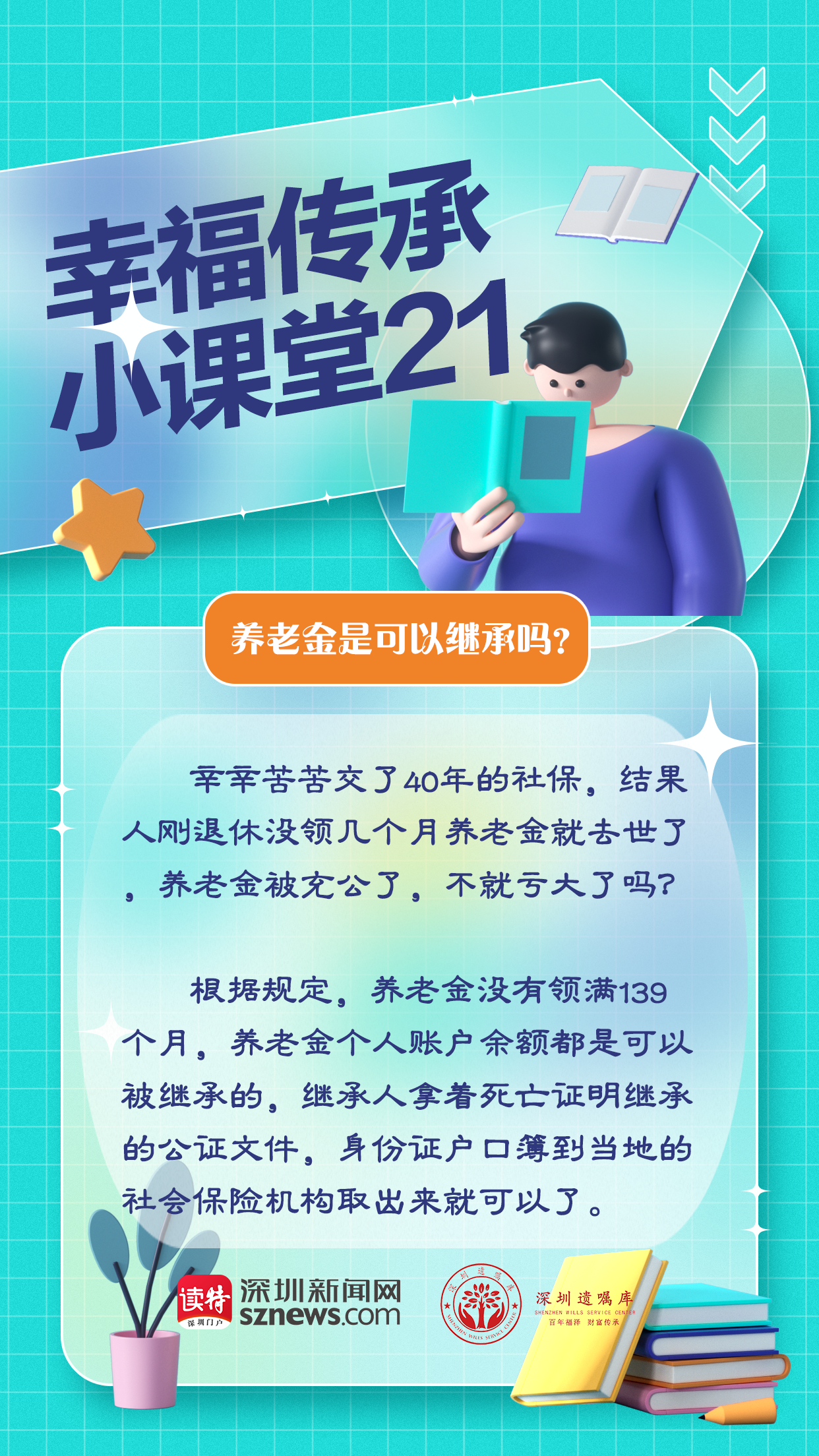 深圳遺囑庫(kù)與深圳新聞網(wǎng)聯(lián)合制作的幸福傳承小課堂第21期,我們來(lái)聊聊養(yǎng)老金繼承問題。根據(jù)規(guī)定,養(yǎng)老金沒有領(lǐng)滿139個(gè)月,養(yǎng)老金個(gè)人賬戶余額都是可以被繼承的。繼承人拿著死亡證明繼承的公證文件,身份證戶口簿到當(dāng)?shù)氐纳鐣?huì)保險(xiǎn)機(jī)構(gòu)取出來(lái)就可以了。