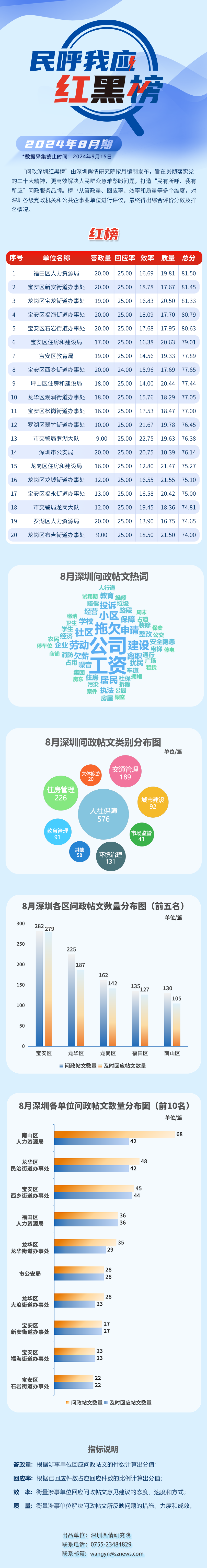本期榜單采集的帖文主要來自深圳市及各區(qū)政府官網、深圳論壇、人民網領導留言板、深圳新聞網“民呼我應”等平臺,所采集帖文發(fā)布時間為2024年8月1日至8月31日,采集截止時間為2024年9月15日。