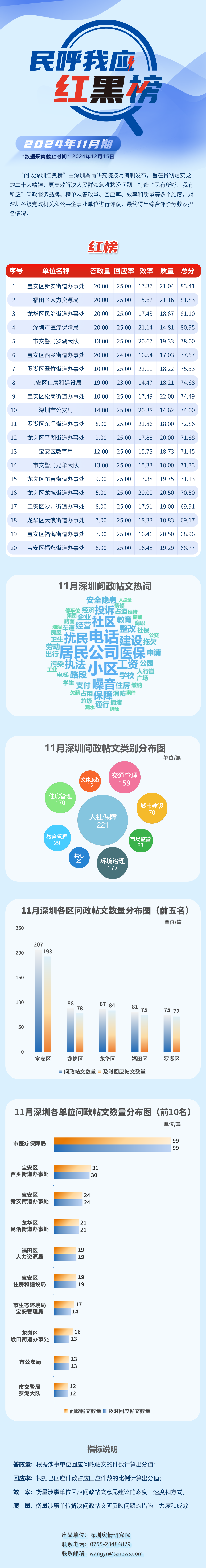 “深圳民呼我應(yīng)紅黑榜”由深圳輿情研究院按月編制發(fā)布,旨在貫徹落實(shí)黨的二十大精神,更高效解決人民群眾急難愁盼問題,打造“民有所呼、我有所應(yīng)”問政服務(wù)品牌。榜單從答政量、回應(yīng)率、效率和質(zhì)量等多個(gè)維度對(duì)深圳各級(jí)黨政機(jī)關(guān)和公共企事業(yè)單位進(jìn)行評(píng)議,最終得出綜合評(píng)價(jià)分?jǐn)?shù)及排名情況。