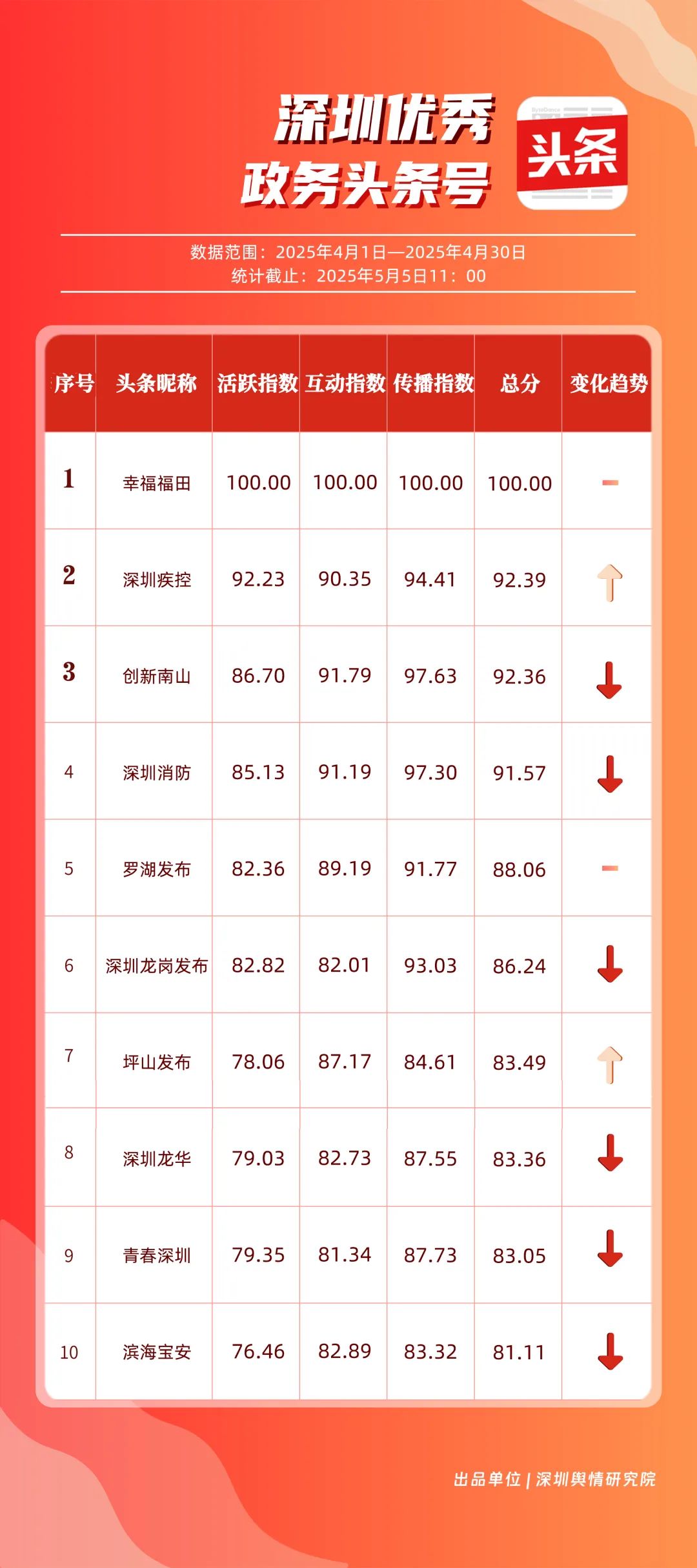 4月,“幸福福田”“深圳疾控”“創(chuàng)新南山”“深圳消防”“羅湖發(fā)布”“深圳龍崗發(fā)布”“坪山發(fā)布”“深圳龍華”“青春深圳”“濱海寶安”共10個政務(wù)頭條號入選“優(yōu)秀政務(wù)頭條號”榜單?!靶腋8L铩毖永m(xù)上月的優(yōu)異表現(xiàn),以優(yōu)質(zhì)的內(nèi)容輸出和穩(wěn)定的用戶互動,位列榜單首位,成為政務(wù)頭條號的標(biāo)桿;“深圳疾控”則以92.39分的亮眼成績排在榜單第二位,凸顯了政務(wù)新媒體在公共衛(wèi)生領(lǐng)域的傳播成果;“創(chuàng)新南山”“深圳消防”“羅湖發(fā)布”緊隨其后,分別在城區(qū)形象宣傳、消防安全領(lǐng)域等方面深耕細(xì)作,持續(xù)擴(kuò)大政務(wù)信息的覆蓋面與影響力。