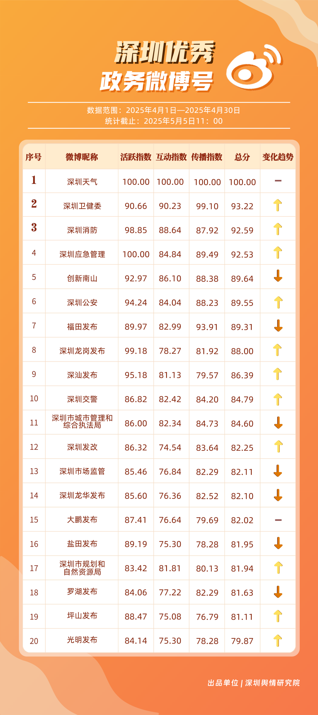 4月,“深圳天氣”“深圳衛(wèi)健委”“深圳消防”“深圳應(yīng)急管理”“創(chuàng)新南山”“深圳公安”“福田發(fā)布”“深圳龍崗發(fā)布”“深汕發(fā)布”“深圳交警”等20個賬號入選“優(yōu)秀政務(wù)微博號”。值得一提的是,“深圳天氣”在多個指標(biāo)中獲得滿分,其氣象信息的趣味性和實(shí)用性受到市民認(rèn)可;“深圳衛(wèi)健委”“深圳消防”“深圳應(yīng)急管理”也在信息傳播、互動服務(wù)等方面持續(xù)發(fā)力,以超過90分的總分緊跟其后;“深汕發(fā)布”“深圳交警”相較于3月在榜單排名有所提升,展現(xiàn)出強(qiáng)勁的發(fā)展勢頭。這些優(yōu)秀政務(wù)微博號的脫穎而出,不僅體現(xiàn)了各自的運(yùn)營實(shí)力,更反映出深圳政務(wù)新媒體在微博平臺的蓬勃發(fā)展態(tài)勢。