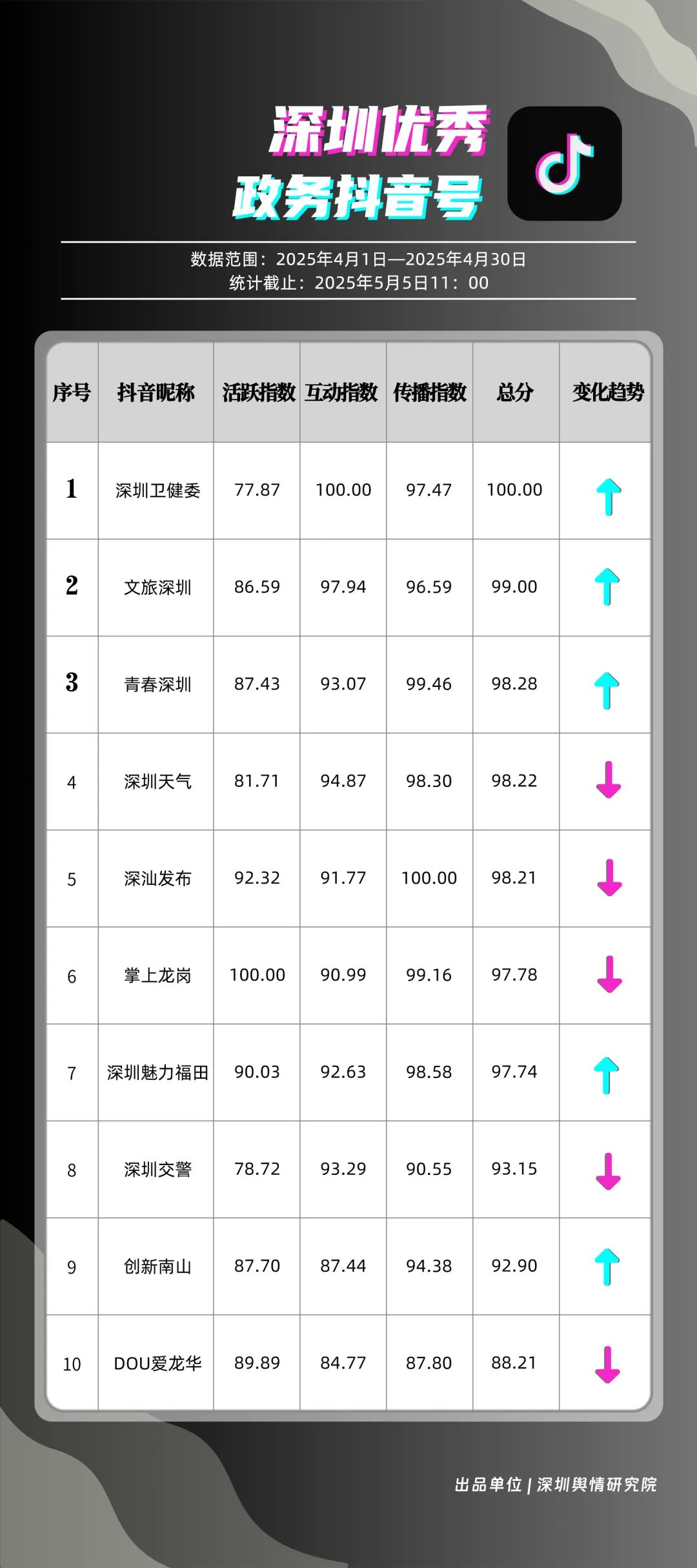 4月,“深圳衛(wèi)健委”“文旅深圳”“青春深圳”“深圳天氣”“深汕發(fā)布”“掌上龍崗”“深圳魅力福田”“深圳交警”“創(chuàng)新南山”“DOU愛龍華”共10個政務(wù)抖音號獲得“優(yōu)秀政務(wù)抖音號”稱號。4月,“深圳衛(wèi)健委”“文旅深圳”“青春深圳”憑借新穎的內(nèi)容策劃、生動的短視頻呈現(xiàn)方式,實(shí)現(xiàn)排名提升,位居榜單前三?!吧钲谔鞖狻薄吧钌前l(fā)布”緊隨其后,以優(yōu)質(zhì)實(shí)用的內(nèi)容、接地氣的表達(dá),持續(xù)擴(kuò)大政務(wù)新媒體的傳播聲量。上榜賬號積極探索創(chuàng)新傳播路徑,以生動有趣的方式傳遞政務(wù)信息,為深圳政務(wù)新媒體在短視頻領(lǐng)域的發(fā)展注入新活力。