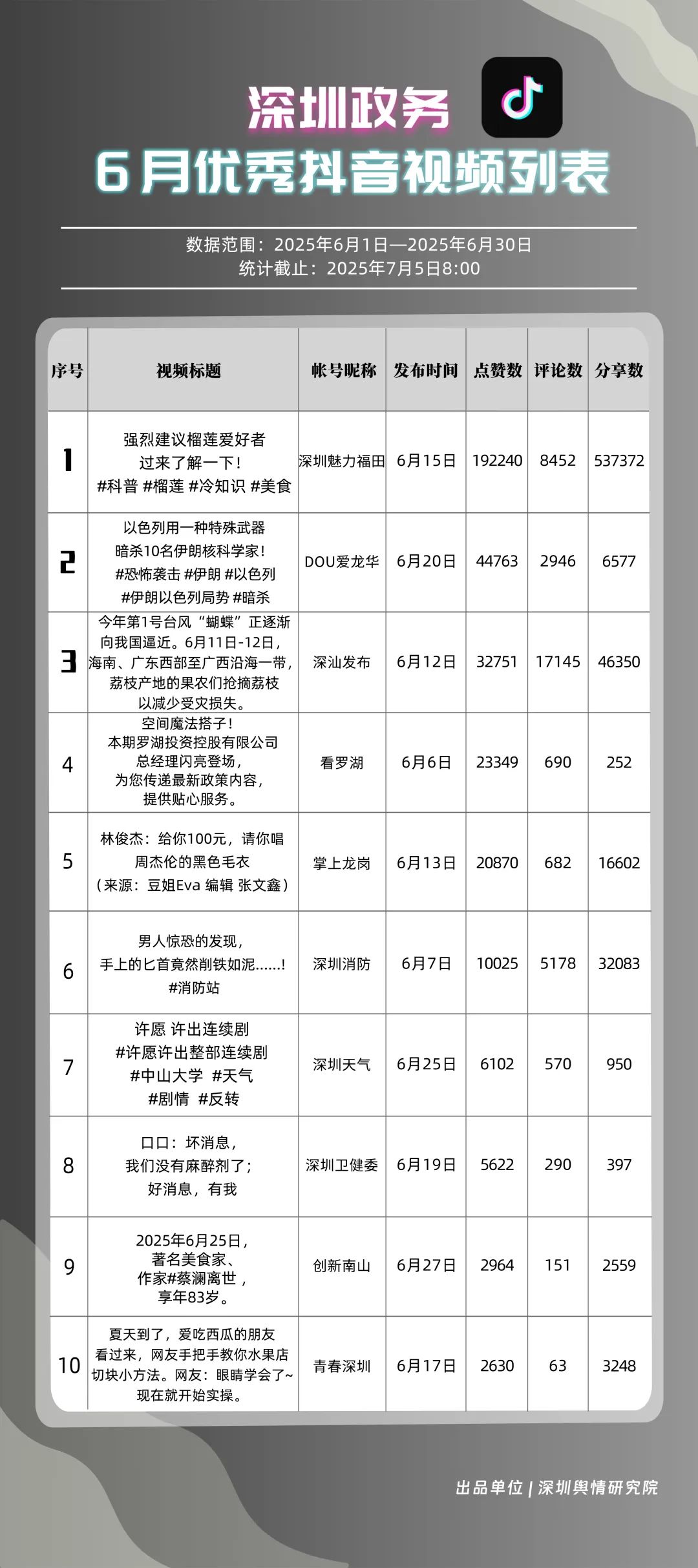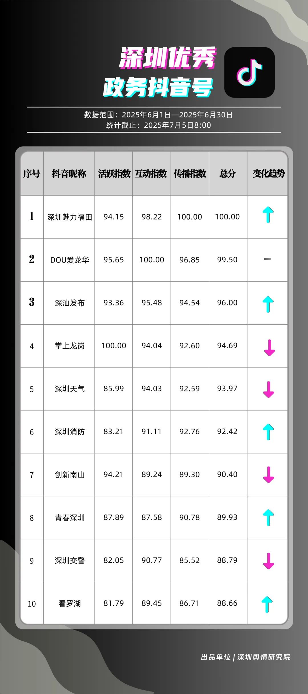 6月,“深圳魅力福田”“DOU愛龍華”“深汕發(fā)布”“掌上龍崗”“深圳天氣”“深圳消防”“創(chuàng)新南山”“青春深圳”“深圳交警”“看羅湖”共10個政務抖音號獲得“優(yōu)秀政務抖音號”稱號。6月,“深圳魅力福田”登頂,憑借其城市人文、社會熱點類主題短視頻,在傳播指數(shù)得分創(chuàng)新高;“DOU愛龍華”“深汕發(fā)布”“掌上龍崗”緊隨其后,通過各類熱點、創(chuàng)意內容提升傳播效能?!吧钲谔鞖狻薄吧钲谙馈币脖憩F(xiàn)突出,短視頻內容兼具“信息傳遞”與“情感共鳴”,用戶參與度持續(xù)提升,不斷為網(wǎng)民傳播有價值的政務信息資訊。