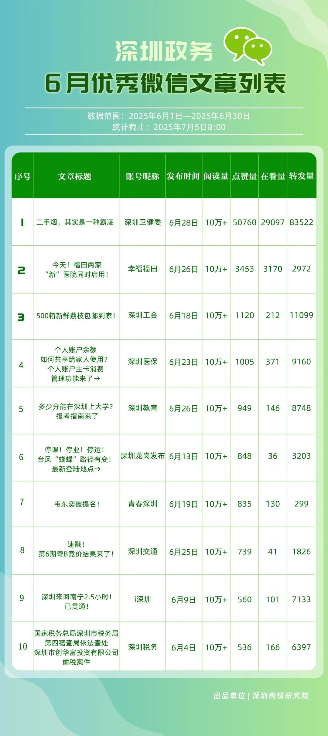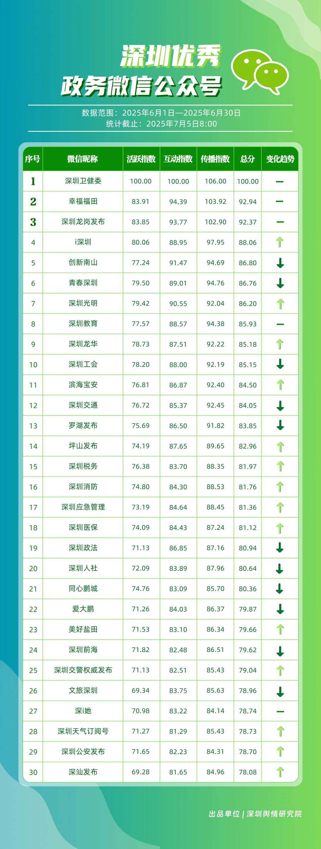 6月,30個政務微信公眾號入選“深圳優(yōu)秀政務微信公眾號”榜單,其中包括“深圳衛(wèi)健委”“幸福福田”“深圳龍崗發(fā)布”“i深圳”“創(chuàng)新南山”“青春深圳”“深圳光明”“深圳教育”“深圳龍華”“深圳工會”等。6月,榜單前三名的賬號保持穩(wěn)定,且各創(chuàng)作出多篇閱讀量超10萬次的優(yōu)質文章,傳播指數(shù)得分均在100分以上?!吧钲谛l(wèi)健委”持續(xù)位居榜首,內容專業(yè)性與傳播力持續(xù)領跑;“幸福福田”以92.94分位居第二,得分較5月有所提高?!吧钲邶垗彴l(fā)布”“i深圳”“創(chuàng)新南山”也積極發(fā)布民生服務與宣傳活動內容,排名靠前。上榜賬號整體呈現(xiàn)“內容精品化、服務場景化”特點,持續(xù)優(yōu)化信息供給質量,為用戶打造有深度的政務信息服務矩陣。