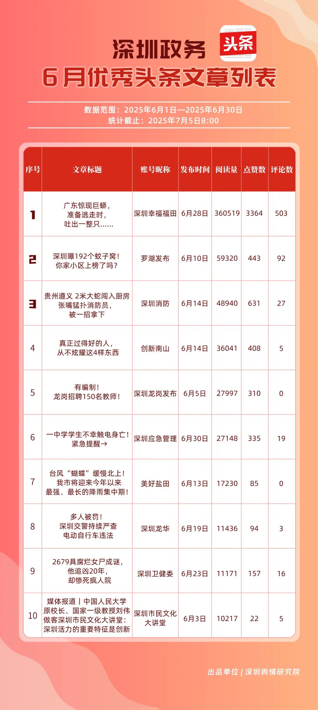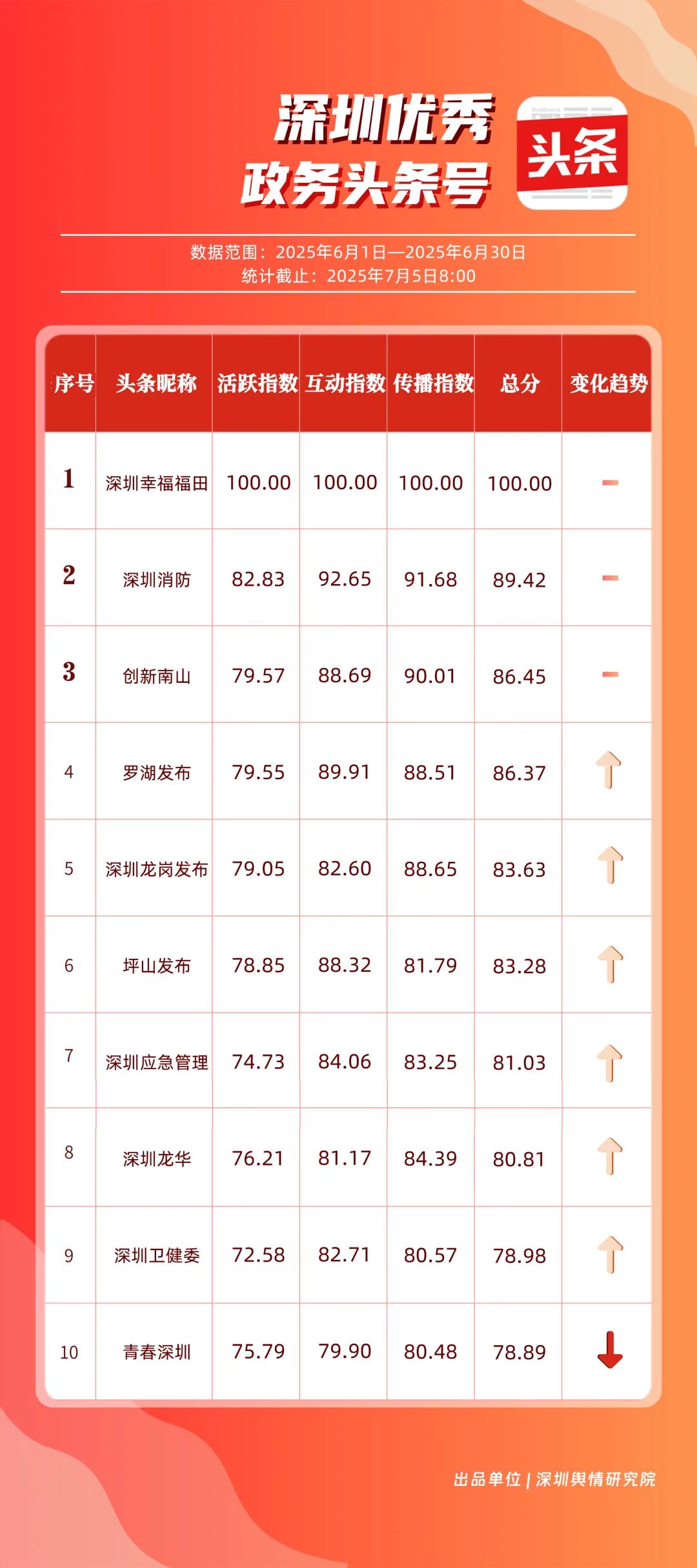 6月,“深圳幸福福田”“深圳消防”“創(chuàng)新南山”“羅湖發(fā)布”“深圳龍崗發(fā)布”“坪山發(fā)布”“深圳應急管理”“深圳龍華”“深圳衛(wèi)健委”“青春深圳”共10個政務頭條號入選“優(yōu)秀政務頭條號”榜單?!吧钲谛腋8L铩薄吧钲谙馈薄皠?chuàng)新南山”連續(xù)位居榜單前3名,內容具備較強的吸引力?!傲_湖發(fā)布”“深圳龍崗發(fā)布”排名也在榜單前列,排名較5月有所上升,在區(qū)域形象宣傳與民生服務中持續(xù)發(fā)力。