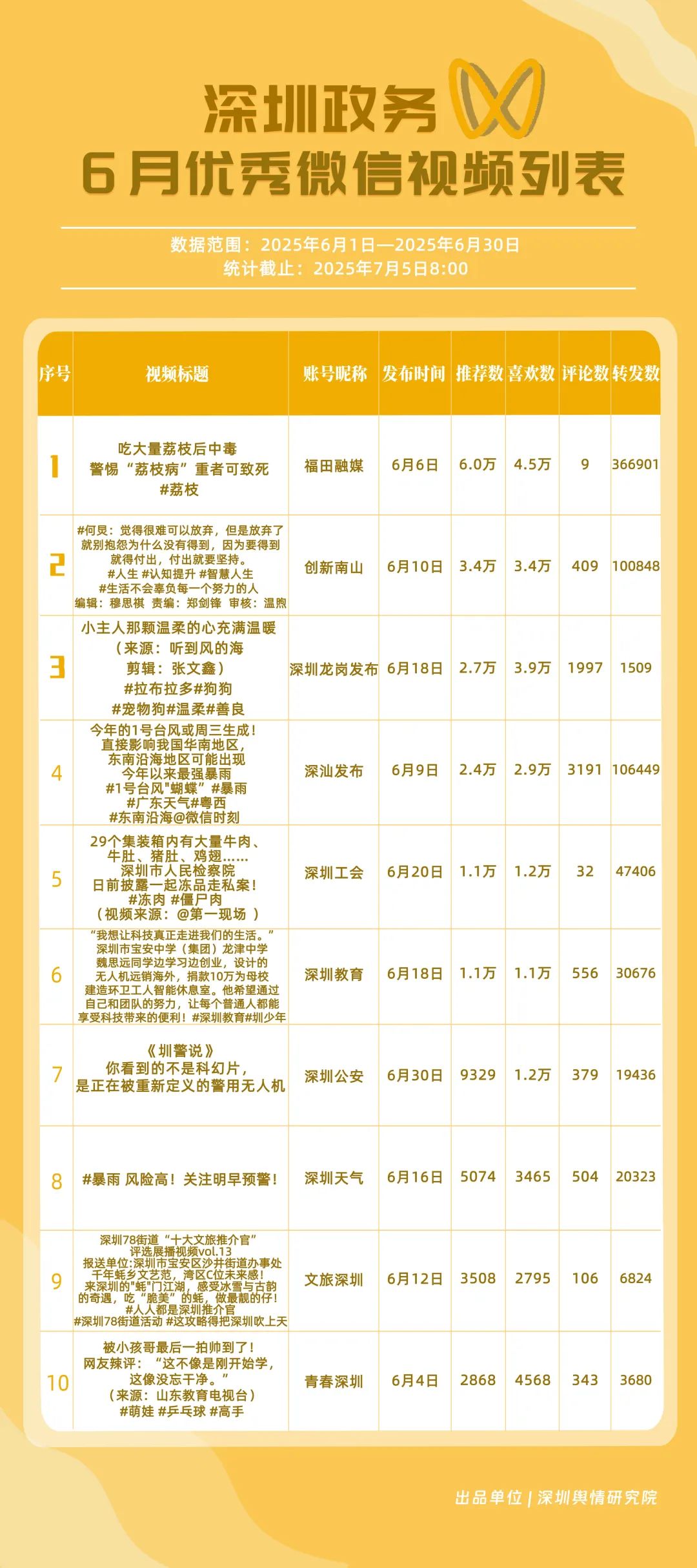 6月,獲得“深圳優(yōu)秀政務微信視頻號”稱號的是“福田融媒”“深汕發(fā)布”“深圳龍崗發(fā)布”“創(chuàng)新南山”“深圳教育”“深圳天氣”“青春深圳”“深圳公安”“文旅深圳”“深圳應急管理”。其中,“福田融媒”以活躍、傳播指數(shù)雙滿分居榜首,其視頻《吃大量荔枝后中毒 警惕“荔枝病”重者可致死》獲得超36萬次轉發(fā),成為爆款案例;“深汕發(fā)布”“深圳龍崗發(fā)布”“創(chuàng)新南山”得分在90分以上,在互動、傳播方面表現(xiàn)亮眼。這些優(yōu)秀的政務微信視頻號以各自的獨特風格持續(xù)發(fā)力,為政務及民生信息傳遞開拓更鮮活、暢通的路徑。