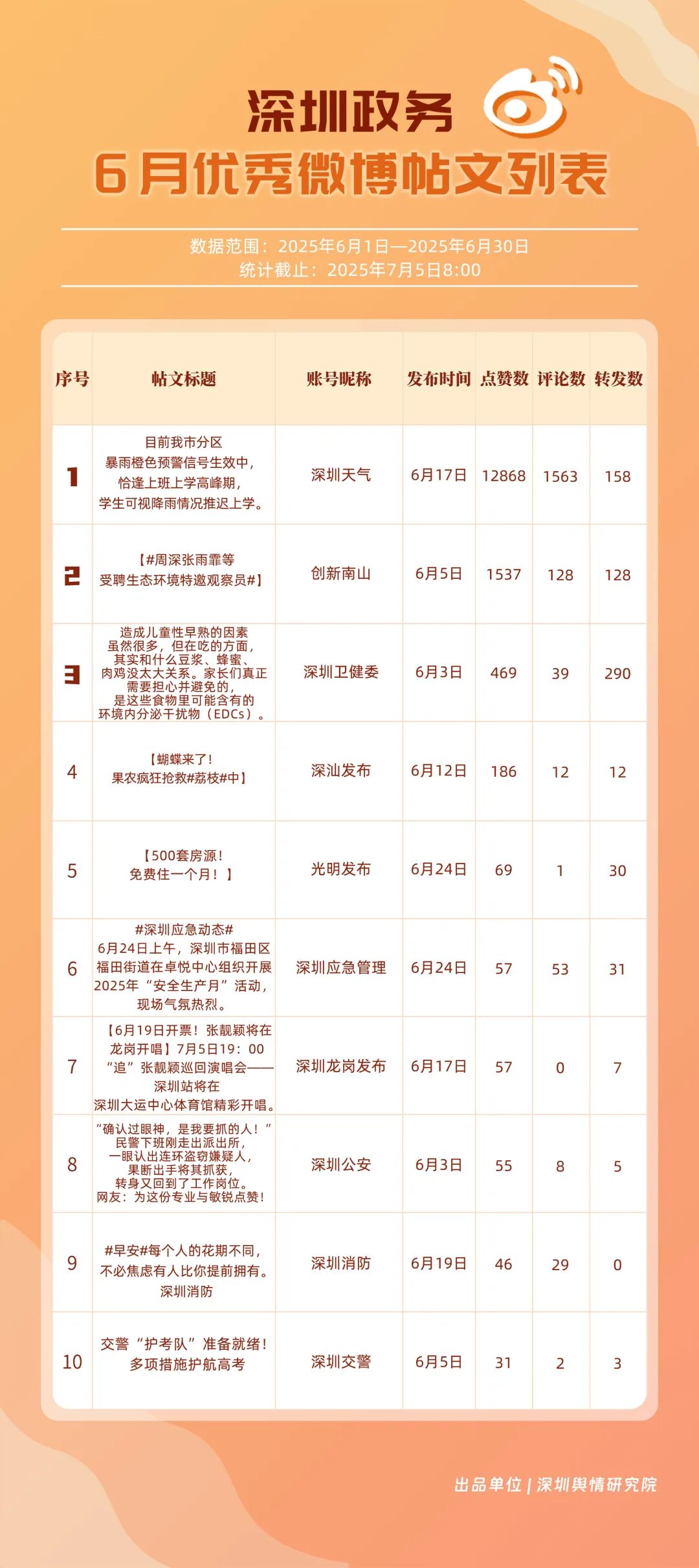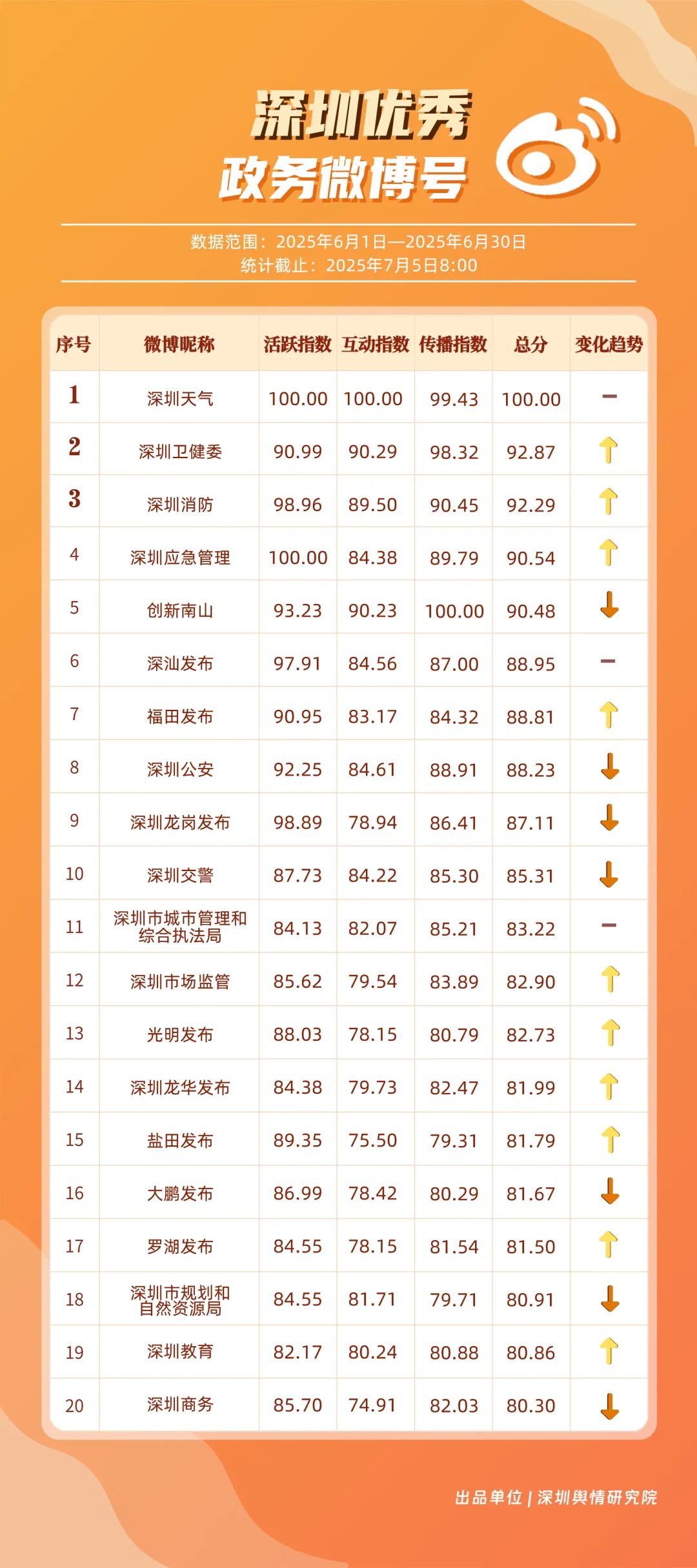6月,“深圳天氣”“深圳衛(wèi)健委”“深圳消防”“深圳應急管理”“創(chuàng)新南山”“深汕發(fā)布”“福田發(fā)布”“深圳公安”“深圳龍崗發(fā)布”“深圳交警”等20個賬號入選“優(yōu)秀政務微博號”。其中,“深圳天氣”以活躍、互動指數(shù)雙滿分穩(wěn)居第一,氣象服務信息及時性與科普內容趣味性獲市民高度認可;“深圳衛(wèi)健委”“深圳消防”“深圳應急管理”分別位列2至4位,通過熱點話題聯(lián)動醫(yī)療、消防、應急知識科普擴大影響力,政務微博矩陣在突發(fā)事件響應與民生服務中作用凸顯。