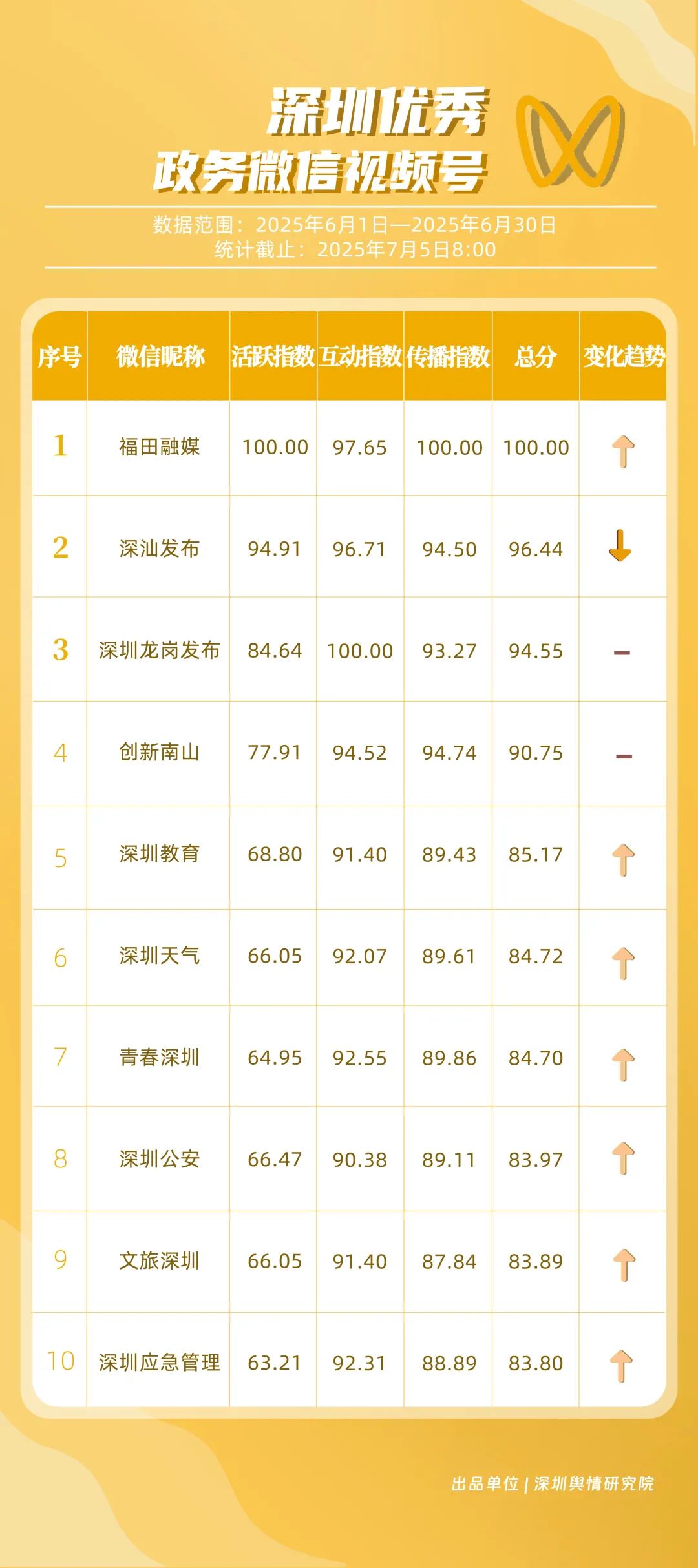 《深圳優(yōu)秀政務新媒體矩陣》將深圳黨政機關、企事業(yè)單位開設的政務公眾號(微信)、微博號、抖音號、視頻號(微信)及頭條號按照活躍指數(shù)、互動指數(shù)、傳播指數(shù)三項指標進行綜合評價,最終形成優(yōu)秀名單。
