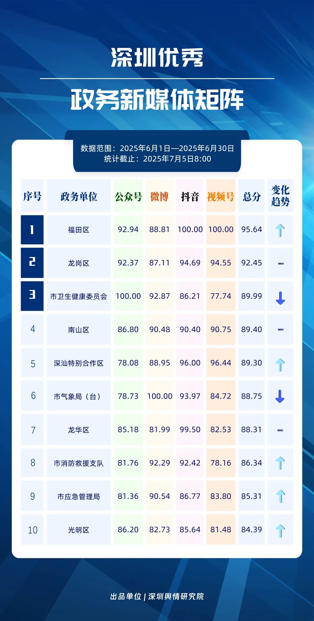 6月,深圳政務新媒體矩陣各展所長,為市民帶來豐富實用的信息服務。福田區(qū)、龍崗區(qū)、市衛(wèi)生健康委、南山區(qū)、深汕特別合作區(qū)、市氣象局、龍華區(qū)、市消防救援支隊、市應急管理局、光明區(qū)新媒體矩陣入選“深圳優(yōu)秀政務新媒體矩陣”榜單。值得關注的是,福田區(qū)新媒體矩陣6月持續(xù)發(fā)力,憑借在抖音、微信視頻號平臺的優(yōu)異表現(xiàn)實現(xiàn)領跑;龍崗區(qū)新媒體矩陣以均衡發(fā)展穩(wěn)居第二;市衛(wèi)生健康委新媒體矩陣在微信公眾號、微博兩平臺收獲較高關注度,位列第三。此外,與5月相比,深汕特別合作區(qū)、市消防救援支隊、市應急管理局、光明區(qū)排名有所上升。