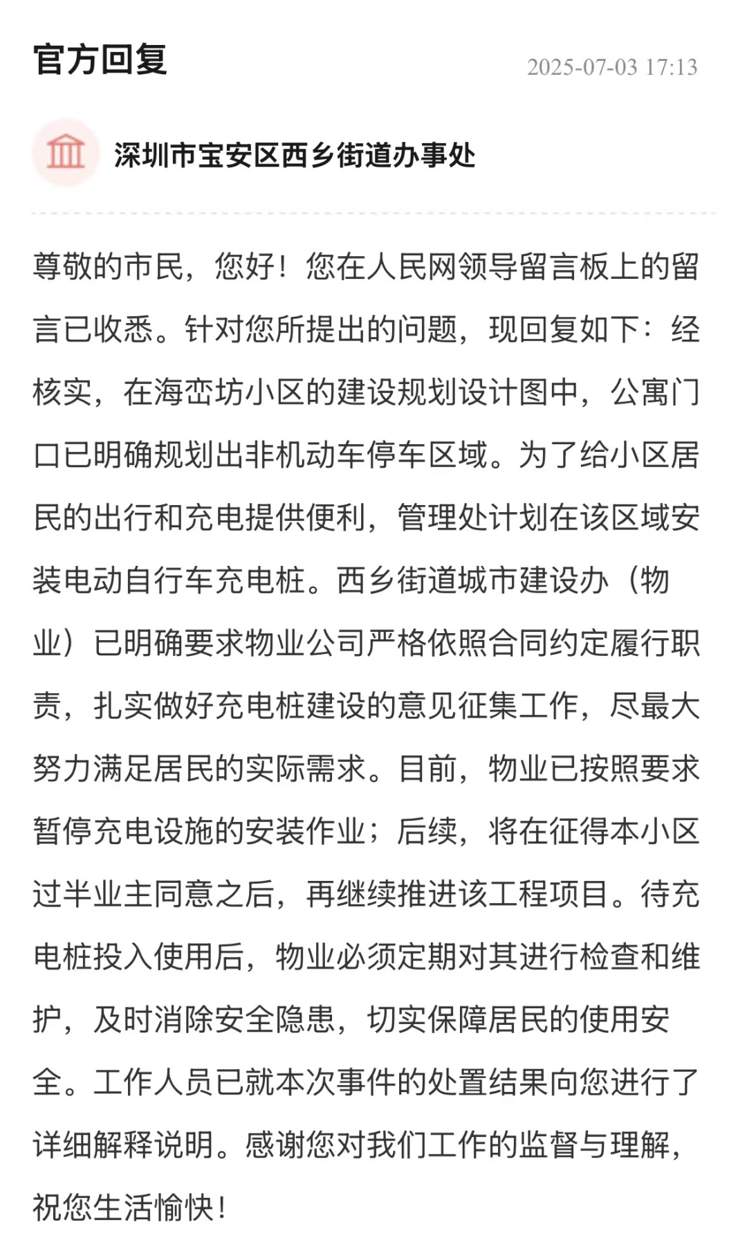 有市民反映寶安區(qū)西鄉(xiāng)街道一小區(qū)物業(yè)強(qiáng)行建設(shè)充電樁