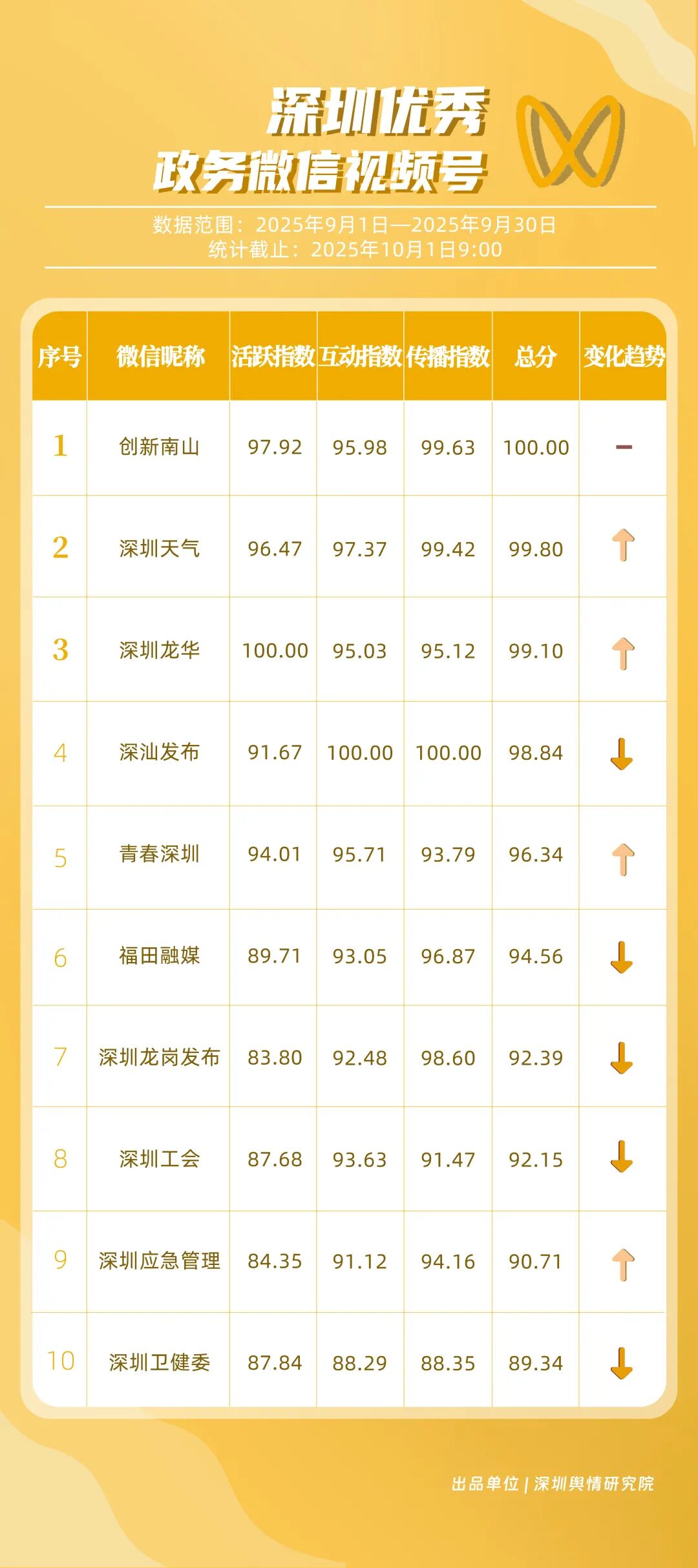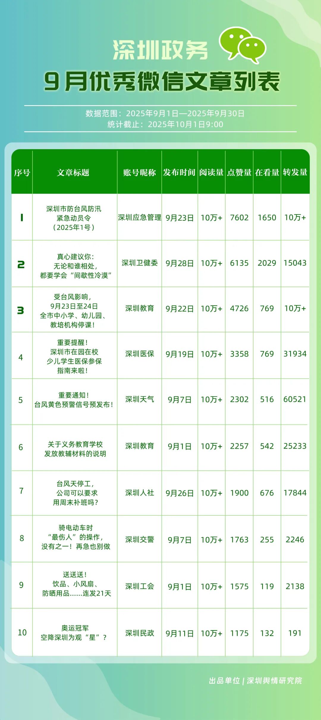 9月,“深圳衛(wèi)健委”“深圳龍崗發(fā)布”“幸福福田”“i深圳”“青春深圳”“深圳工會(huì)”“深圳教育”“深圳交通”“創(chuàng)新南山”“深圳應(yīng)急管理”等30個(gè)政務(wù)微信公眾號(hào)榮登“深圳優(yōu)秀政務(wù)微信公眾號(hào)”榜單。9月,“深圳衛(wèi)健委”以總分100.00的成績(jī)蟬聯(lián)榜單首位,其憑借突破常規(guī)視角的選題,解讀專業(yè)健康知識(shí),引發(fā)大量網(wǎng)民共鳴,內(nèi)容質(zhì)量與傳播力形成雙向賦能;“深圳龍崗發(fā)布”以總分93.24位居第二,聚焦區(qū)域民生服務(wù)升級(jí)等動(dòng)態(tài),信息觸達(dá)率不斷提升;“幸福福田”圍繞商圈經(jīng)濟(jì)復(fù)蘇、文化節(jié)慶活動(dòng)等主題開展系列宣傳,增強(qiáng)區(qū)域活力展示,位列第三;“i深圳”“青春深圳”“深圳工會(huì)”等也持續(xù)優(yōu)化賬號(hào)內(nèi)容,通過實(shí)用信息推送強(qiáng)化政務(wù)服務(wù)定位。