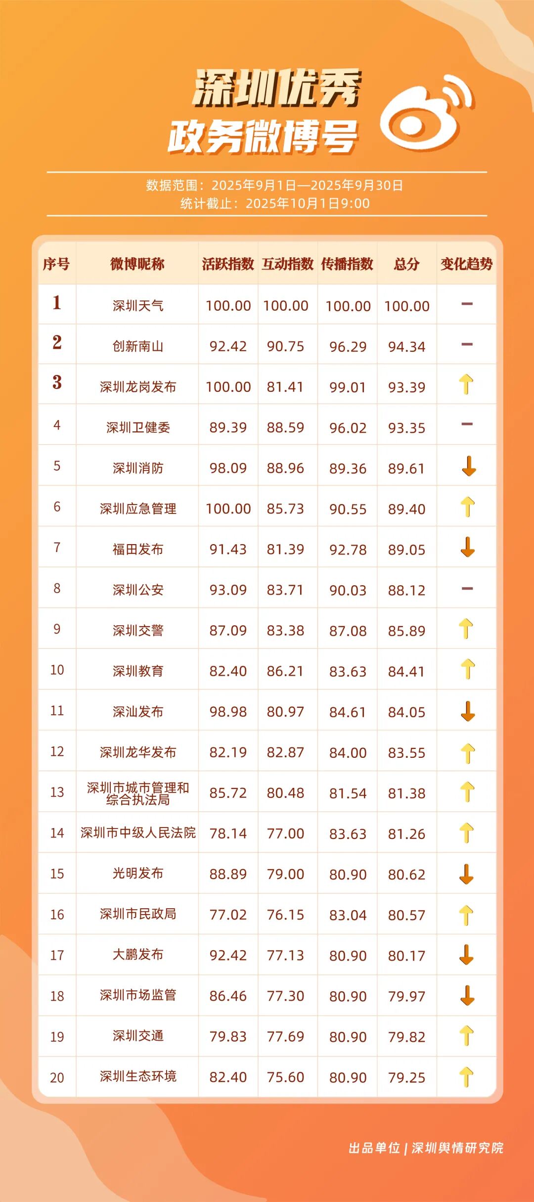 9月,20個(gè)賬號(hào)入選“優(yōu)秀政務(wù)微博號(hào)”榜單,其中包括:“深圳天氣”“創(chuàng)新南山”“深圳龍崗發(fā)布”“深圳衛(wèi)健委”“深圳消防”“深圳應(yīng)急管理”“福田發(fā)布”“深圳公安”“深圳交警”“深圳教育”等。其中,“深圳天氣”蟬聯(lián)榜首,尤其9月出現(xiàn)臺(tái)風(fēng)天氣,賬號(hào)受關(guān)注度再提升;“創(chuàng)新南山”賬號(hào)以多維度內(nèi)容策略實(shí)現(xiàn)傳播效能提升,其內(nèi)容中與歌手周深的聯(lián)動(dòng)也成為一大亮點(diǎn),獲得了較好傳播效果,以94.34分排名榜單第二;“深圳龍崗發(fā)布”“深圳衛(wèi)健委”兩賬號(hào)得分均在93分以上,在區(qū)域宣傳、內(nèi)容科普方向發(fā)力。上榜優(yōu)秀微博賬號(hào)展現(xiàn)出較高的內(nèi)容創(chuàng)新能力,以年輕化語態(tài)構(gòu)建傳播體系,形成兼具專業(yè)性與傳播力的優(yōu)秀案例。