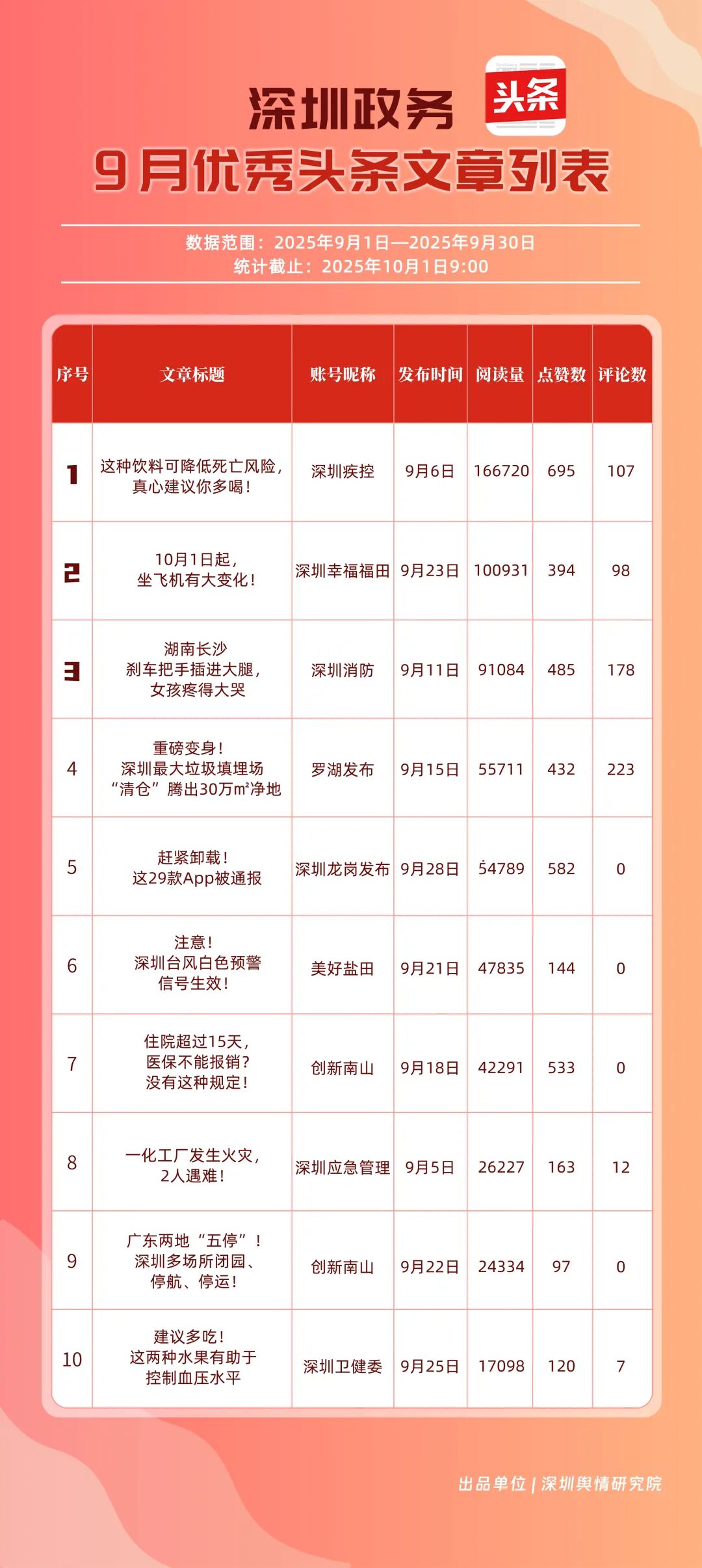 9月,“深圳幸福福田”“深圳疾控”“深圳消防”“羅湖發(fā)布”“深圳龍崗發(fā)布”“創(chuàng)新南山”“深圳龍華”“青春深圳”“深圳人社”“濱海寶安”共10個(gè)政務(wù)頭條號(hào)入選“優(yōu)秀政務(wù)頭條號(hào)”榜單?!吧钲谛腋8L铩狈€(wěn)居榜單首位,在傳播、互動(dòng)等方面均表現(xiàn)卓越;“深圳疾控”關(guān)注民生健康,有關(guān)“喝茶的好處”“非正規(guī)醫(yī)美針風(fēng)險(xiǎn)”兩篇文章閱讀均超10萬次,為市民提供健康信息;“深圳消防”聚焦消防安全領(lǐng)域,提醒市民注意安全。相關(guān)上榜賬號(hào)表現(xiàn)優(yōu)異,注重內(nèi)容實(shí)用化、互動(dòng)場(chǎng)景化,彰顯了政務(wù)新媒體的服務(wù)效能。