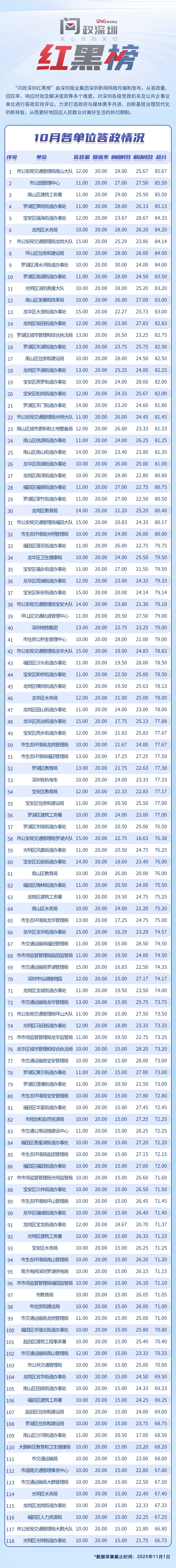 “問政深圳紅黑榜”具有科學(xué)、合理、完備的綜合評價體系,能夠綜合評估深圳各級黨政機關(guān)和公共企事業(yè)單位的答政情況。