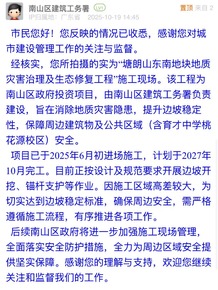 案例點評:針對市民疑慮,相關(guān)部門的回應(yīng)展現(xiàn)出“透明化+精細化”的治理思路:第一時間明確工程屬性并同步告知工期安排,主動消解市民對工程進展的不確定性擔(dān)憂;同時,南山區(qū)建筑工務(wù)署還表示后續(xù)將進一步加強現(xiàn)場管理,回應(yīng)關(guān)切。這種回應(yīng)思路既解決了市民的困惑,也通過可感知的舉措傳遞了對安全的重視態(tài)度,是城市工程類訴求處置中“信息公開”“風(fēng)險閉環(huán)”的有效示范。