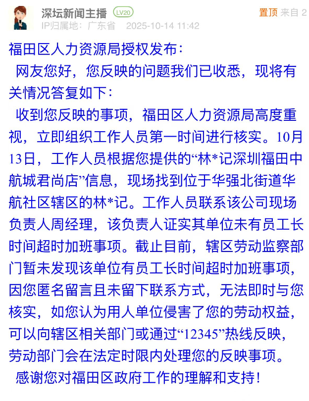 優(yōu)化建議:網(wǎng)民投訴的核心有兩點,一是外包公司無勞務(wù)派遣資質(zhì)卻代繳社保、發(fā)放工資,二是工作時間過長。福田區(qū)人力資源局雖回應(yīng)已核實涉事餐飲單位“無長時間超時加班”,但對網(wǎng)民反映的外包公司無資質(zhì)這一關(guān)鍵問題未作回應(yīng)。此情況反映出,資質(zhì)核查工作亟需加強,如對相關(guān)餐飲單位開展用工合規(guī)專項檢查,以精準(zhǔn)舉措解決無資質(zhì)外包這一核心痛點,提升市民對勞動者權(quán)益保障工作的認可度。