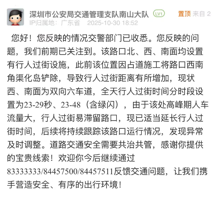 案例點評:南山交管部門在24小時內(nèi)對市民所反饋的問題進行答復(fù),展現(xiàn)出精準(zhǔn)、高效的治理態(tài)度,既說明過街時間短的原因,又根據(jù)該路口在高峰期人流大的實際情況,適當(dāng)延長過街時間,體現(xiàn)出“因需調(diào)整、務(wù)實便民”的理念?;貞?yīng)中,該部門還強調(diào)后續(xù)將持續(xù)跟蹤路口通行情況、及時優(yōu)化調(diào)整等,展示了精細化治理的決心和理念。