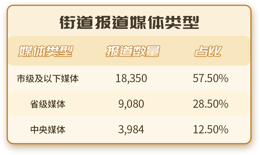 先看媒體類型,全年報道中,市級及以下媒體占比57.5%,省級媒體占比28.5%,兩者合計超過八成。也就是說,街道的大部分傳播,首先發(fā)生在區(qū)域媒體體系之中,被本地社會所看見、討論和接收。這樣的分布并不意外。街道離居民最近,日常工作也最貼近城市運行的細(xì)部肌理,無論是基層治理、社區(qū)服務(wù),還是環(huán)境整治、民生保障,本身都帶有很強的屬地屬性,天然更容易進(jìn)入本地媒體的觀察視野。