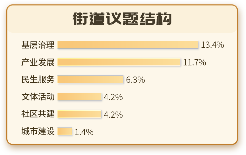 從全年報道分類情況看,基層治理以13.4%的占比居于首位,產(chǎn)業(yè)發(fā)展占比11.7%,民生服務(wù)占比6.3%,三類議題共同構(gòu)成街道傳播最主要的內(nèi)容來源。