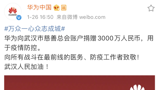 1月26日,華為官方微博“華為中國”宣布,華為向武漢市慈善總會賬戶捐贈3000萬人民幣,用于疫情防控。