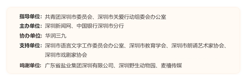 為助力建設(shè)良好的青少年閱讀環(huán)境,激發(fā)學(xué)生閱讀興趣,倡導(dǎo)親子閱讀,共建和諧家庭關(guān)系。2022年,“誰是故事大王·第六季”在共青團深圳市委員會、深圳市關(guān)愛行動組委會辦公室的指導(dǎo)下再出發(fā)?;顒佑缮钲谛侣劸W(wǎng)、中國銀行深圳市分行主辦,華潤三九協(xié)辦,得到了廣東省鹽業(yè)集團深圳有限公司、深圳野生動物園、麥禧傳媒的大力支持。更長的活動周期,更豐富的參與形式,更專業(yè)的賽制,等你來解鎖與挑戰(zhàn)!讓閱讀成為最動人的風(fēng)景,讓故事的魅力感動深圳。說明:所有參賽者報名成功后,均承認(rèn)并允許主辦方將個人參加本次活動的照片或視頻相關(guān)資料刊發(fā)在各類媒體雜志報紙上,用于活動宣傳。